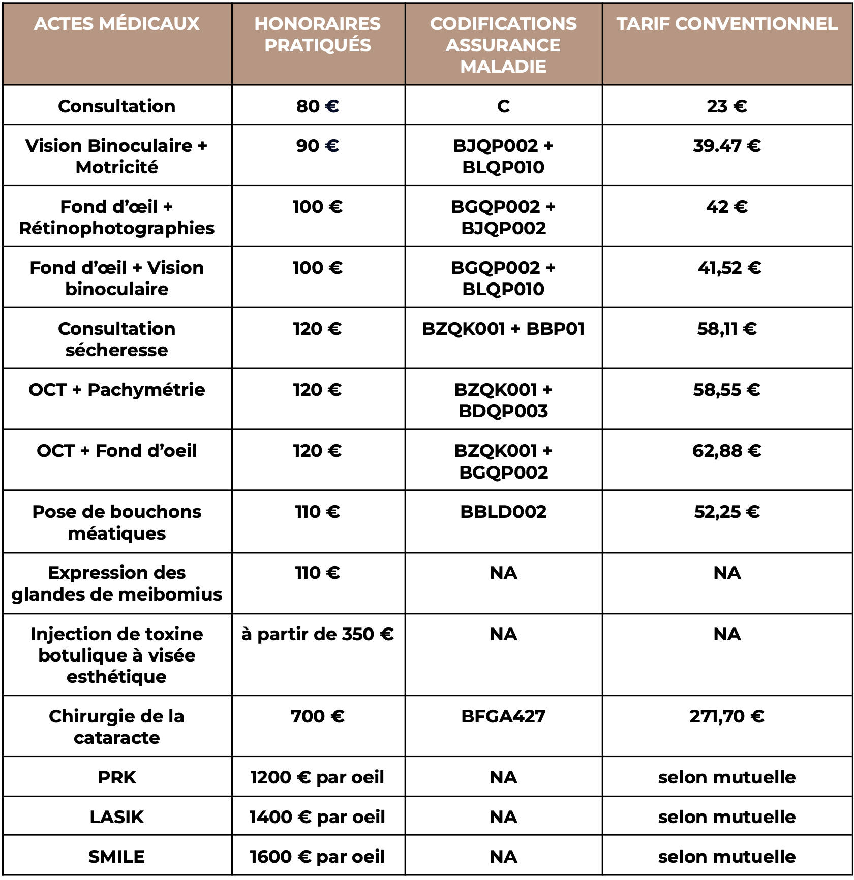 Le taux de remboursement dans la cadre du parcours de soins coordonné du régime général de Sécurité sociale est de 70% (30% hors parcours) du tarif conventionnel (correspondant au tarif de la colonne de droite ou base de remboursement de la Sécurité Sociale sans les compléments d’honoraires). Le taux de remboursement est de 100% du tarif conventionnel en cas ALD (Affection longue durée), CSS (Complémentaire Santé Solidaire), ACS (Aide à la complémentaire santé). Un à plusieurs actes pourront être effectués, seuls deux actes seront facturés ; un troisième acte pourra exceptionnellement être comptabilisé, dans des circonstances particulières. Ces actes sont comptés aux taux de 100% ou de 50% de leur valeur selon leurs modalités d’association conformément à la réglementation. Des actes d’orthoptie (cotation AMY) peuvent s’y ajouter, sans complément d’honoraires facturable ; le taux de remboursement dans la cadre du parcours de soins coordonné du régime général de Sécurité sociale est de 60% pour les actes d’orthoptie. Votre ophtalmologiste est évidemment prêt à vous fournir les explications nécessaires et à s’entretenir avec vous de difficultés qui pourraient apparaître. En cas de chirurgie (cataracte, chirurgie réfractive…) un devis personnalisé vous sera remis en mains propres, afin que vous puissiez vérifier la base de remboursement auprès de votre assurance complémentaire santé.