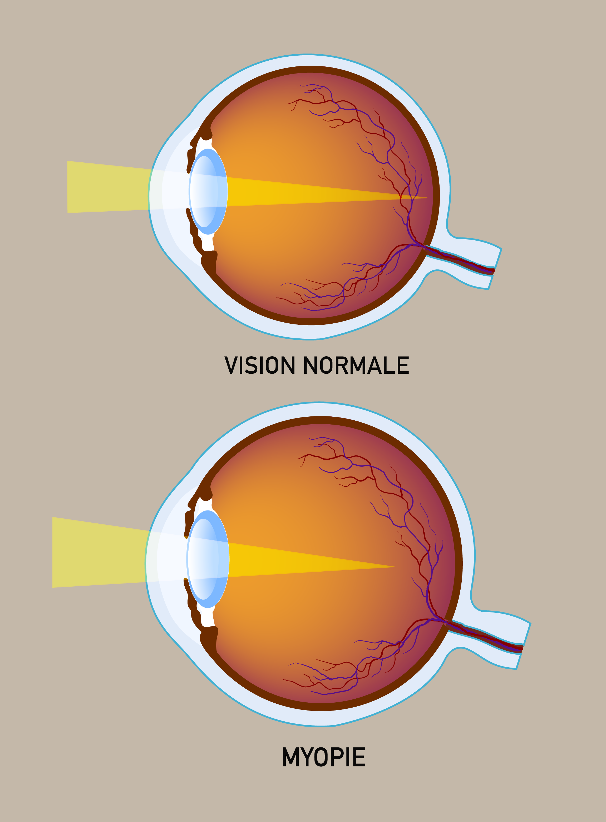 Elle résulte d’un déséquilibre dans la forme de l’œil : celui-ci est souvent trop long, ou bien la cornée est trop bombée. Cette configuration fait que les rayons lumineux convergent avant la rétine, au lieu de se focaliser directement sur elle, rendant les objets éloignés difficiles à distinguer.